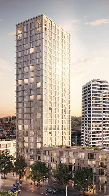 Die dezente Eichentür heisst Sie willkommen. Sie halten Ihren Badge an den elektronischen Griff und öffnen die Tür zu Ihrem Zuhause. Nach einem langen Tag im Büro hat Ihre Wohnung schon auf Sie gewartet. Der lange Flur mit dem crèmefarbenen Eichenparkett ist stimmungsvoll beleuchtet. Sie lassen Ihre Tasche neben den Einbauschrank fallen. Im Ankleidebereich im grossen Schlafzimmer streifen Sie den Tag ab und schlüpfen in ein bequemes Outfit. In der offenen Küche mit den eleganten platingrauen Schränken schenken Sie sich ein kühles Glas Chardonnay ein. Abendsonne fällt durch die raumhohen Fenster und flutet den offenen Wohn- und Essbereich mit warmem Licht. Hier ist es immer hell und freundlich. Sie setzen sich an den Bistrotisch auf der Loggia und blicken über die Dächer des Quartiers in die Ferne.
